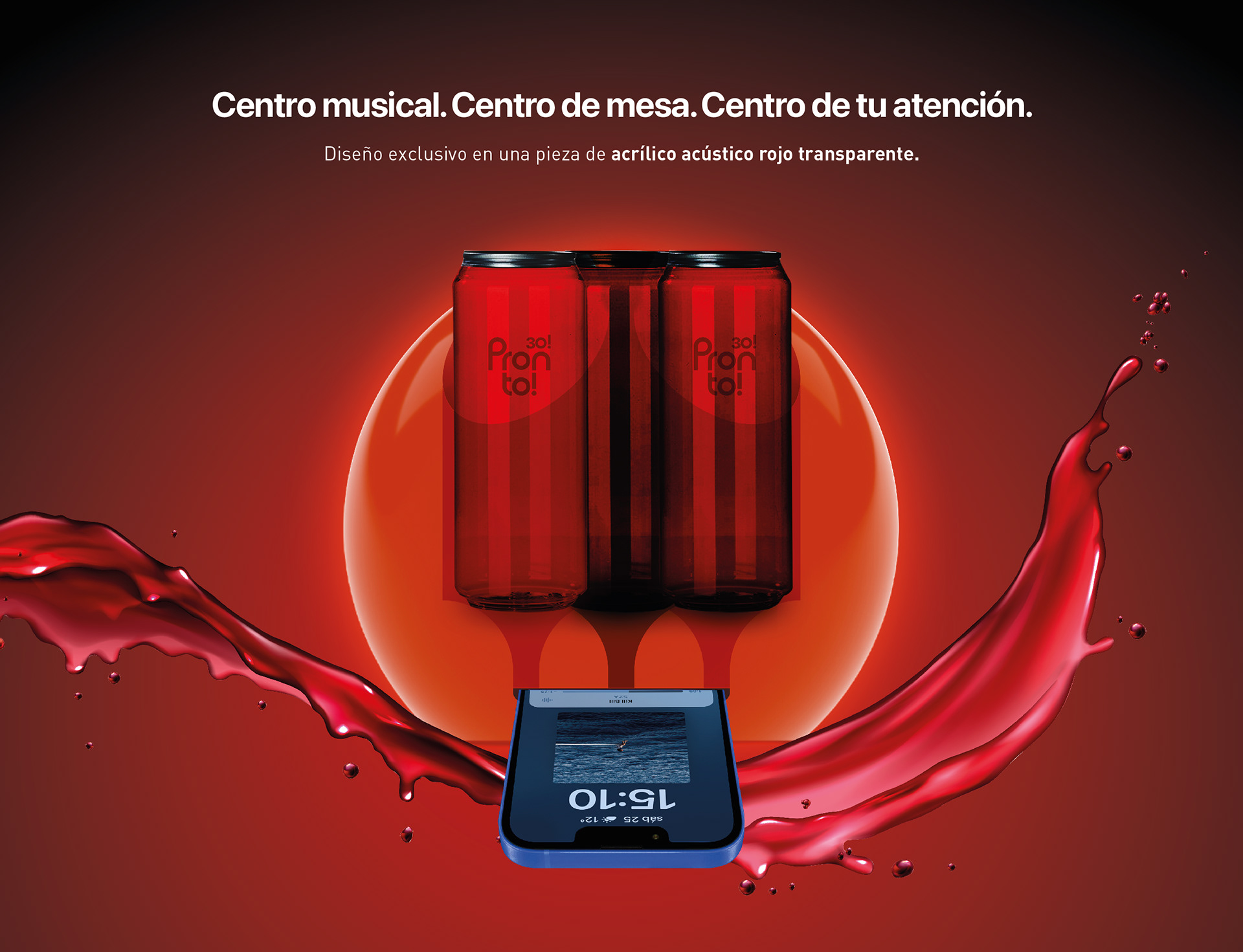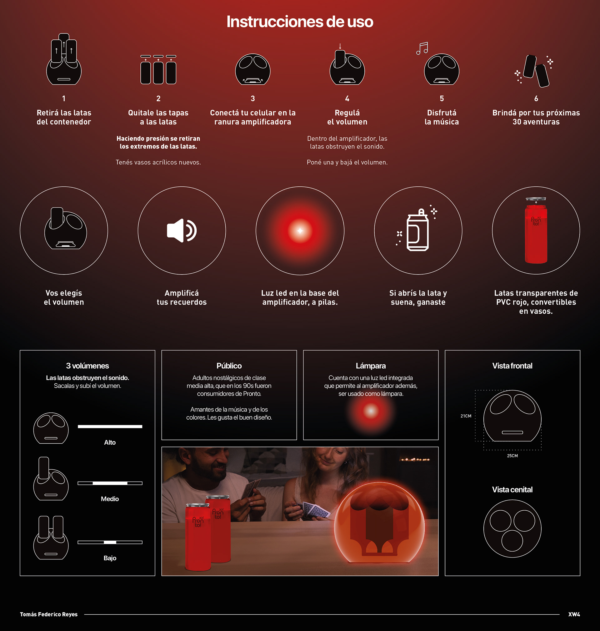 Diseño de amplificador contenedor para Pronto Bitt, que tenga una segunda funcionalidad además de transportar las tres latas. Idea y diseño: Tomás Reyes. Trabajo universitario para la cátedra XW4 de la Facultad de Diseño, Arquitectura y Urbanismo de la Universidad de Buenos Aires (FADU).